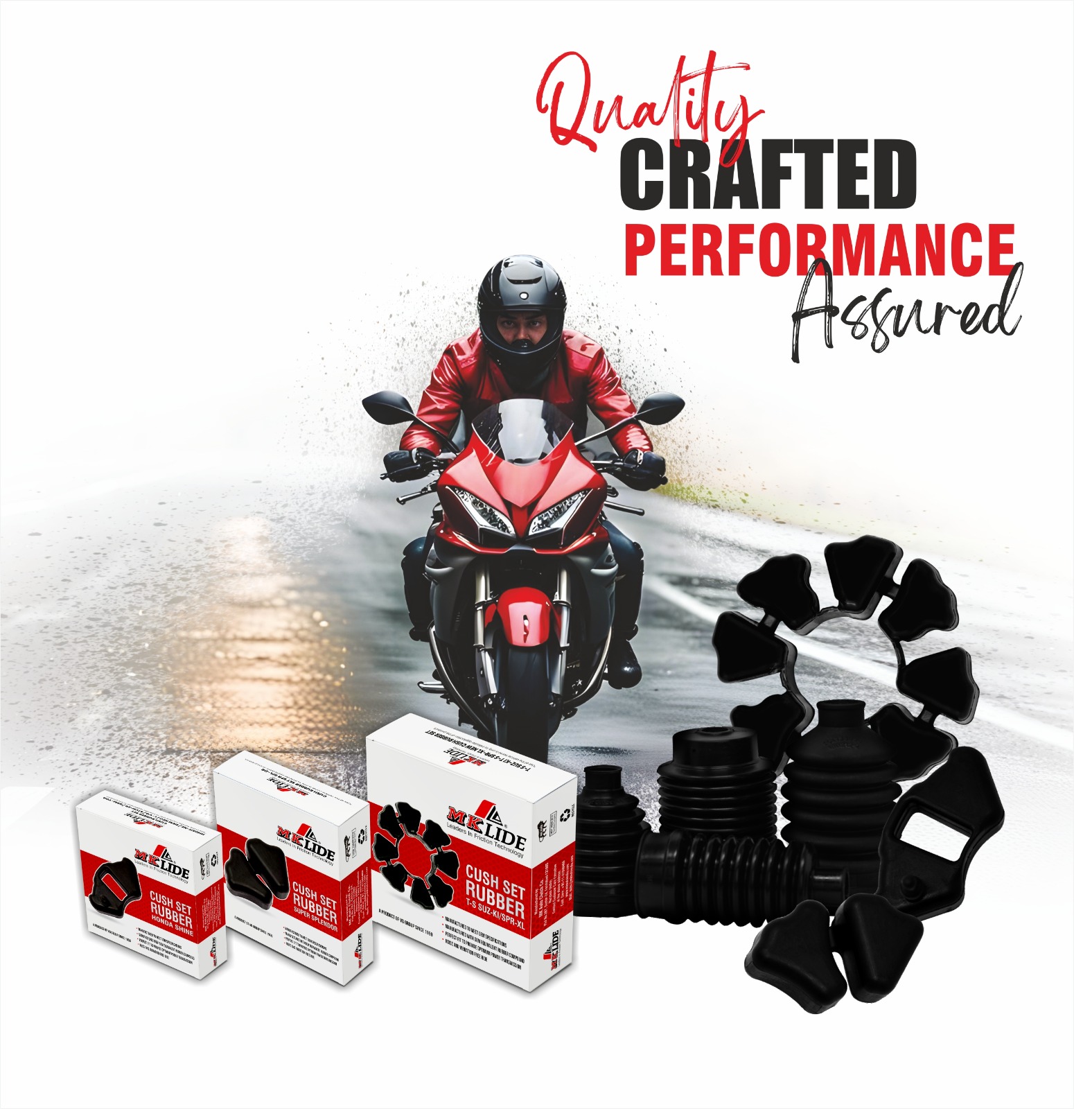 At MK LIDE, We understand the importance of Ride Quality and Performance. Our Cush Rubber Parts are precisely engineered to improve vibration dampening and Power Transmission — especially for today’s advanced Motorcycles like Honda Shine, among others.
